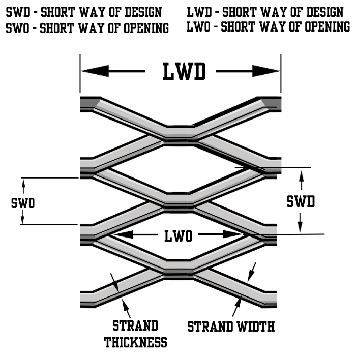 | 1 1/2 X 6 GA RAISED EXPANDED METAL 1 1/2 X 6 GA RAISED EXPANDED METAL/Asset/Raised-Expanded-Metal-Model.png | Short Way of Diamond (SWD) (in) N/A 1.33 | Long Way of Diamond (LWD) (in) N/A 3 | Short Way of Opening (SWO) (in) N/A 0.979 | Long Way of Opening (LWO) (in) N/A 2.313 | Strand Thickness (in) N/A 0.198 | Strand Width (in) N/A 0.203 | Weight Per Square Foot (lb) N/A 2.25 | Material N/A Carbon Steel | Finish N/A Bare | Grade N/A A1011 |