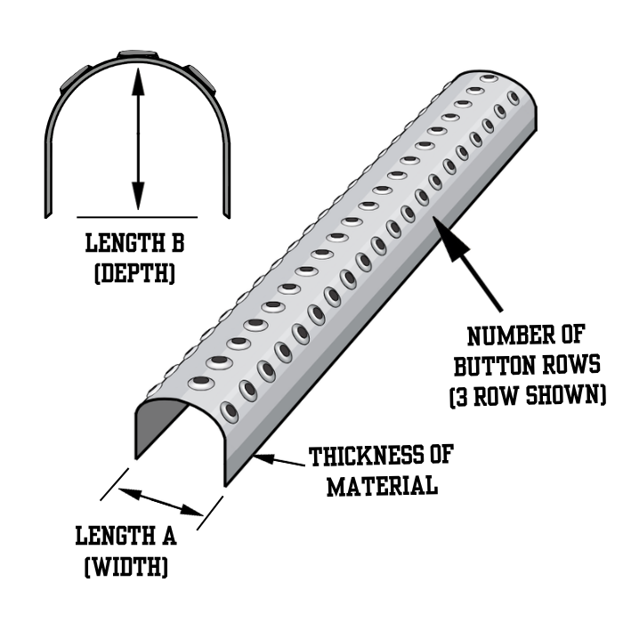 | LADDER RUNG PLANK (2 ROW BUTTON TOP) LADDER RUNG PLANK (2 ROW BUTTON TOP)/Asset/Ladder-Rungs-Model.png | Length A (in) N/A 1-1/4 | Length B (in) N/A 1.5 | Thickness of Material (in) N/A 0.090 | Thickness of Material (gauge) N/A 13 | Material N/A Carbon Steel | Type N/A Raised Perforation | Finish N/A HRPO or Galvanized | Weight Per Square Foot (lb) N/A 1.08 |