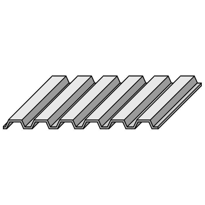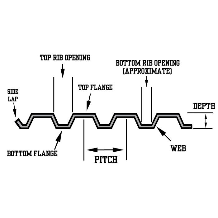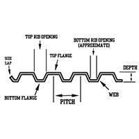 | 1 1/2 X 20 GA TYPE B (WR) METAL ROOF DECKING 1 1/2 X 20 GA TYPE B (WR) METAL ROOF DECKING/Asset/Wide-Rib-Metal-Decking-Model.png | Depth (in) N/A 1-1/2 | Top Rib Opening (in) N/A 2-5/8 | Bottom Rib Opening (in) N/A 1-5/8 | Pitch (in) N/A 6 | Thickness (gauge) N/A 20 | Thickness (in) N/A 0.0358 | Weight Per Square Foot (lb) N/A 2.10 | Type N/A Type B (WR - Wide Rib) | Finish N/A Bare Galvanized Painted |